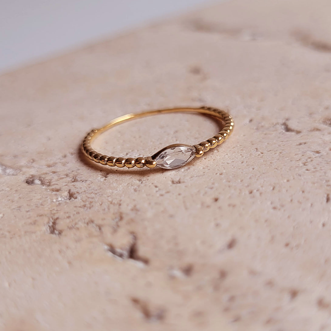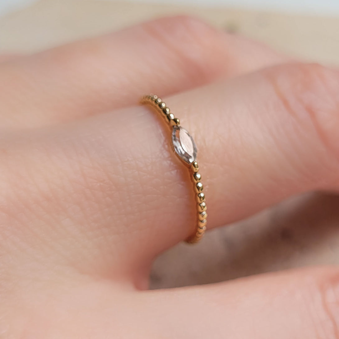 Este delicado anel de ouro 18k é um solitário formato Navete com uma linda pedra Topázio Natural cor translucida. Esta peça de jóia atemporal será um acréscimo precioso à sua coleção. A perfeita combinação de estilo moderno e delicado, este anel com certeza deixará a sua marca. Use-o sozinho ou combine-o com diversos anéis criando assim um visual único.